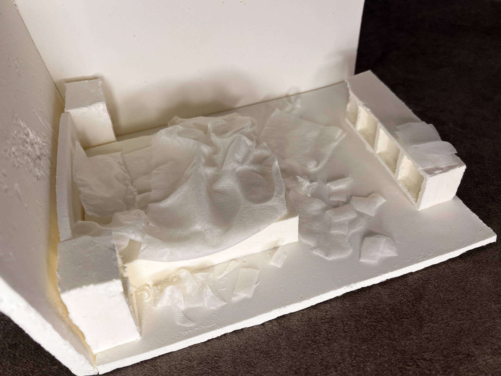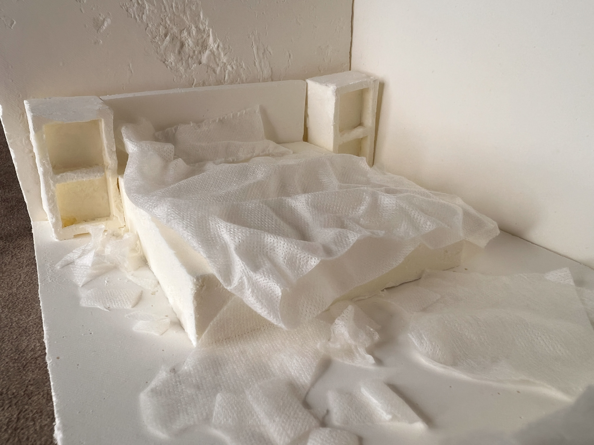 Manipulovala jsem s 3D skenem vlastního aktu jako s jistou formou terapie a smířením se sama se sebou a svou nahotou, jelikož to byl vždy můj odvěký problém. Digitální verzi jsem zpracovala do atmosferických renderů a použila tyto obrazy jakožto ilustrace k vlastním autorským textům. Fyzickou verzi jsem vyretušovala, opatřila bílým akrylovým lakem a upravila do podoby křehké porcelánové figurky.
