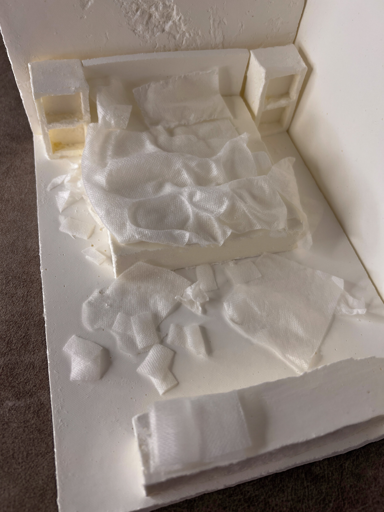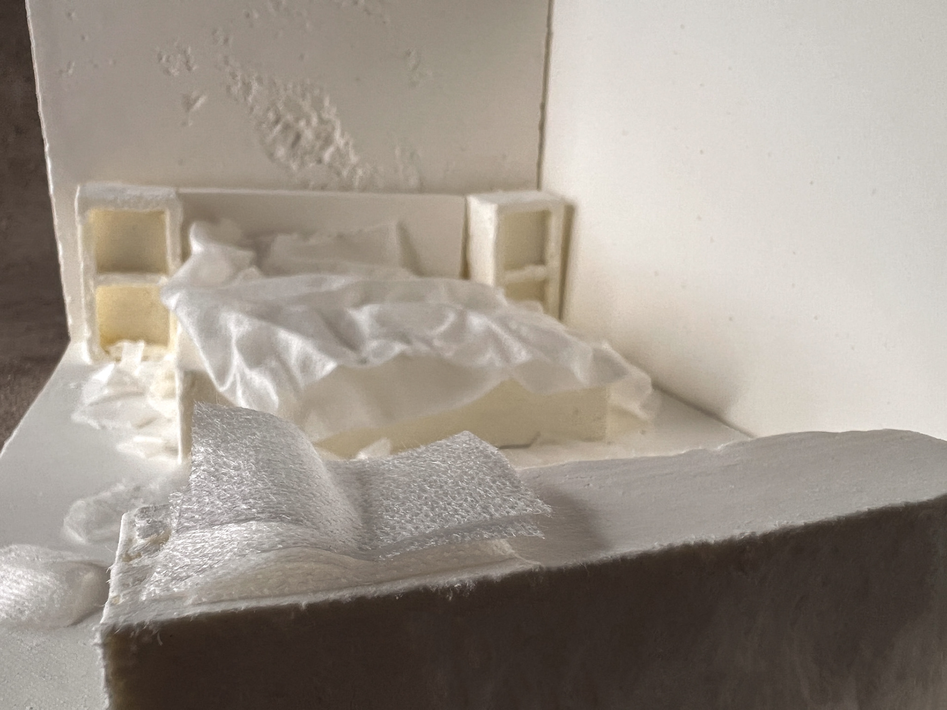 Ve své diplomové práci se zabývám zpracováním hlubokých emocí spojených s loučením; jednak s procesem samotného rozloučení, ale i se smiřováním se s permanentním opuštěním blízké osoby i místa, které pro mě bylo po dlouhá léta útočištěm. Téma vychází z mé osobní zkušenosti a odráží nejen bolest, zmatek a neurčité ticho, které tento proces provázely, ale i křehkou cestu k přijetí nové reality. Nejde jen o konec důležitého vztahu v mém životě, ale také o definitivní rozloučení s prostorem naplněným vzpomínkami – pokojem, který byl svědkem mého dospívání, citových zlomů i každodenních rituálů.