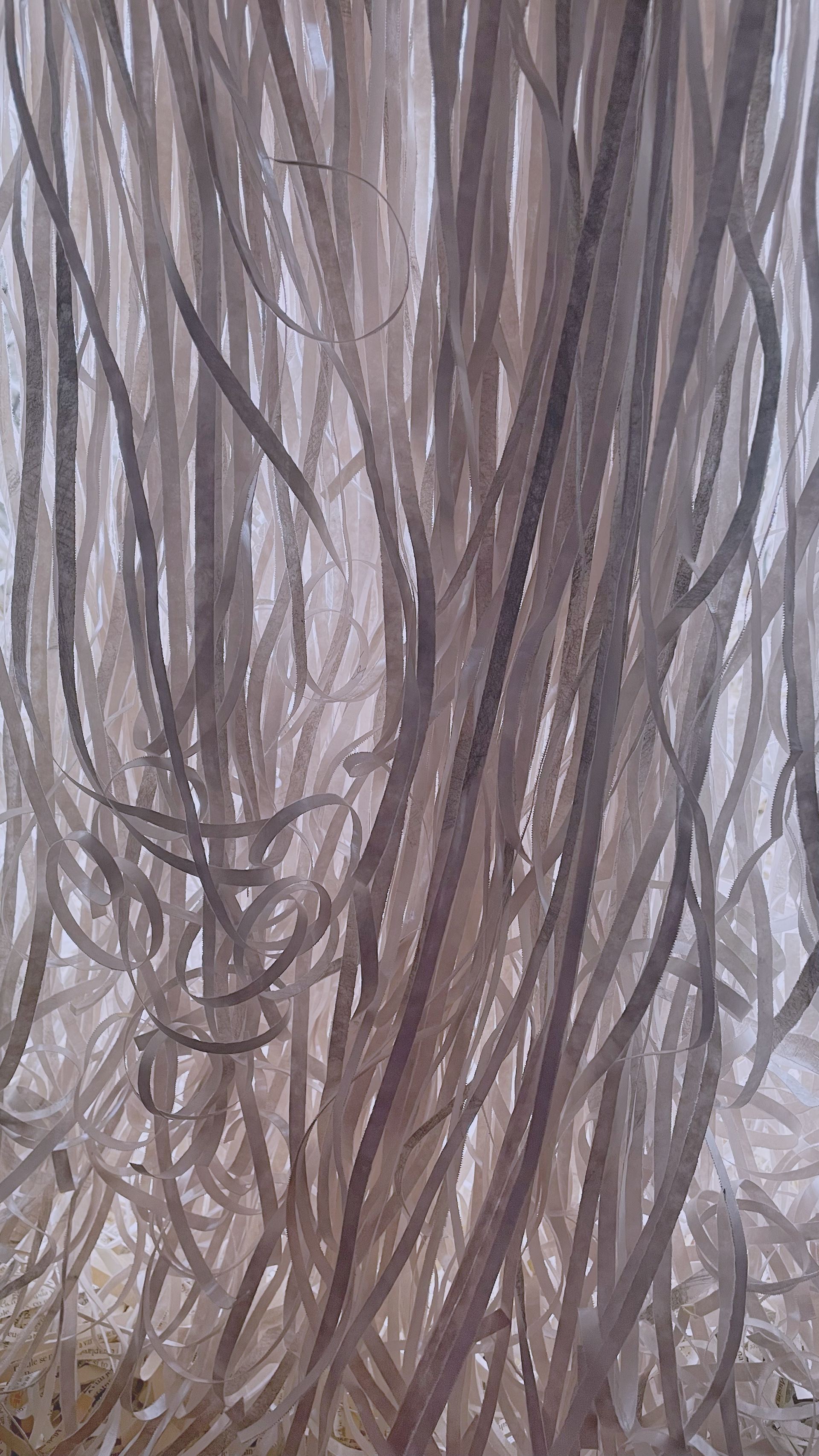 A tak postupně vznikaly texty, povídky a básně, které proudily v tom množství chaosu jako pruhy textu. Tato instalace je vizuální reprezentací této situace.